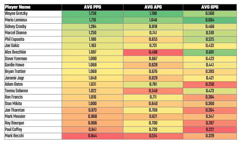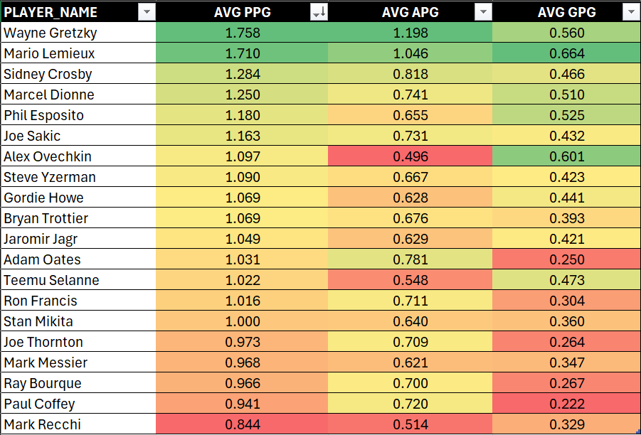 To do this, we're going to carry forward our preferred narrative from this lesson, which is the following: "Two superstars stand above the rest, Wayne Gretzky and Mario Lemieux. They had significantly different styles that were both effective and they were revered players in their era." We'll of course have to explore the idea of NHL superstars peaking through this narrative, which we'll do through our analyses.