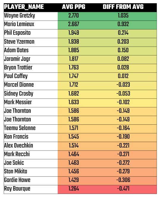 You can already see some of this based on the above analyses that we did. However, below we've summarized the Points per Game by season and then calculated the difference from the average. Now, if you stopped here, you might miss a lot of nuance, so it's important to think second-level on your analyses. For example, the positions of these players would impact their PPG as would the eras within which they played. That said, it's pretty clear that Wayne Gretzky and Mario Lemieux stand out. While a delta of ~1 may not seem like a huge number, it's significant: this delta represents approximately one more point per game that they were able to achieve when compared to their peers.