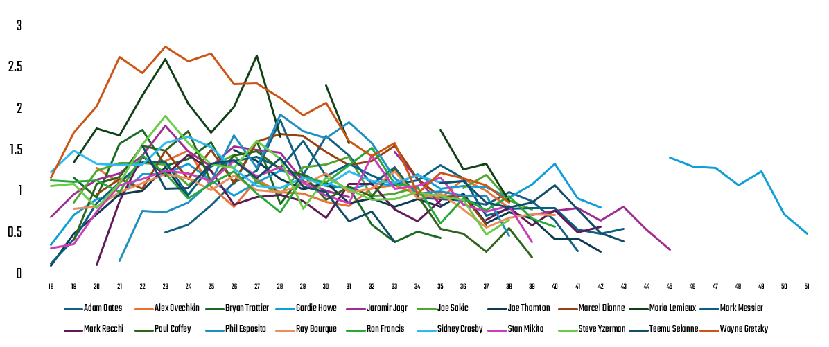 Again, another potential story that we had not anticipated emerged from this simple analysis: Joe Sakic's multiple peaks and consistency in play across his 20-year career or Jaromir Jagr's single peak in his twenty-year career.