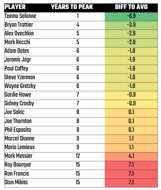The below view begins to get at a more secondary level of information. That is, out of all of the superstars, the average number of years to get to peak performance is 7.9 years. This view shows a) the individual player's time to performance peak (YEARS TO PEAK) and b) the delta between their timeframe and the average (DIFF TO AVG).