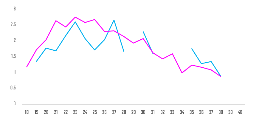 - They had peaks at 23, but they also had multiple peaks in their career.