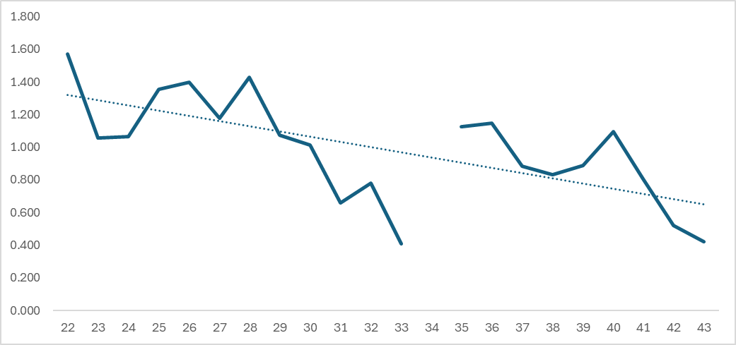 We looked at this in a couple of ways (both included in the aforementioned spreadsheet). The first was using a heatmap and the second through a trend view where we lay the data across each player's Age along the X-axis and then plotted the Points per Game by season on the Y-axis. This results in a multi-line graph; however, discerning (even visually) individual performance peaks is not easy. You get a general and cluttered sense of trending at best.