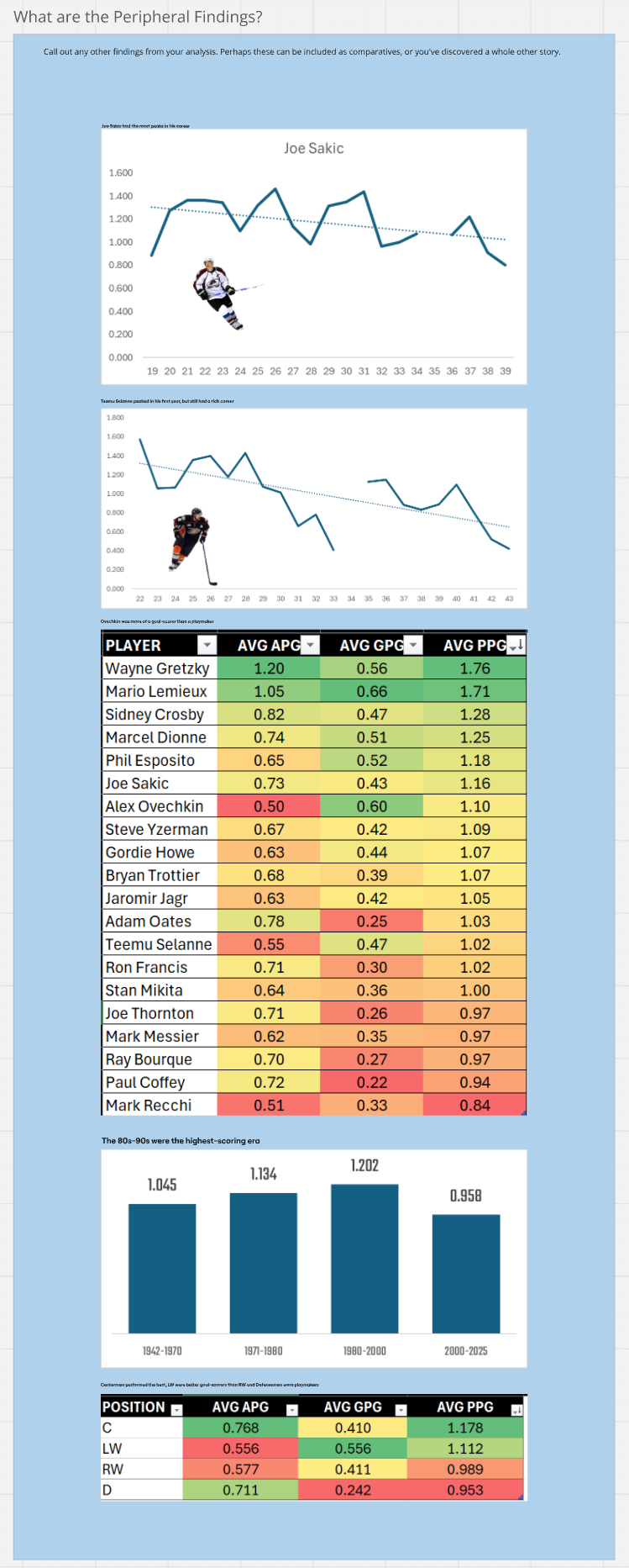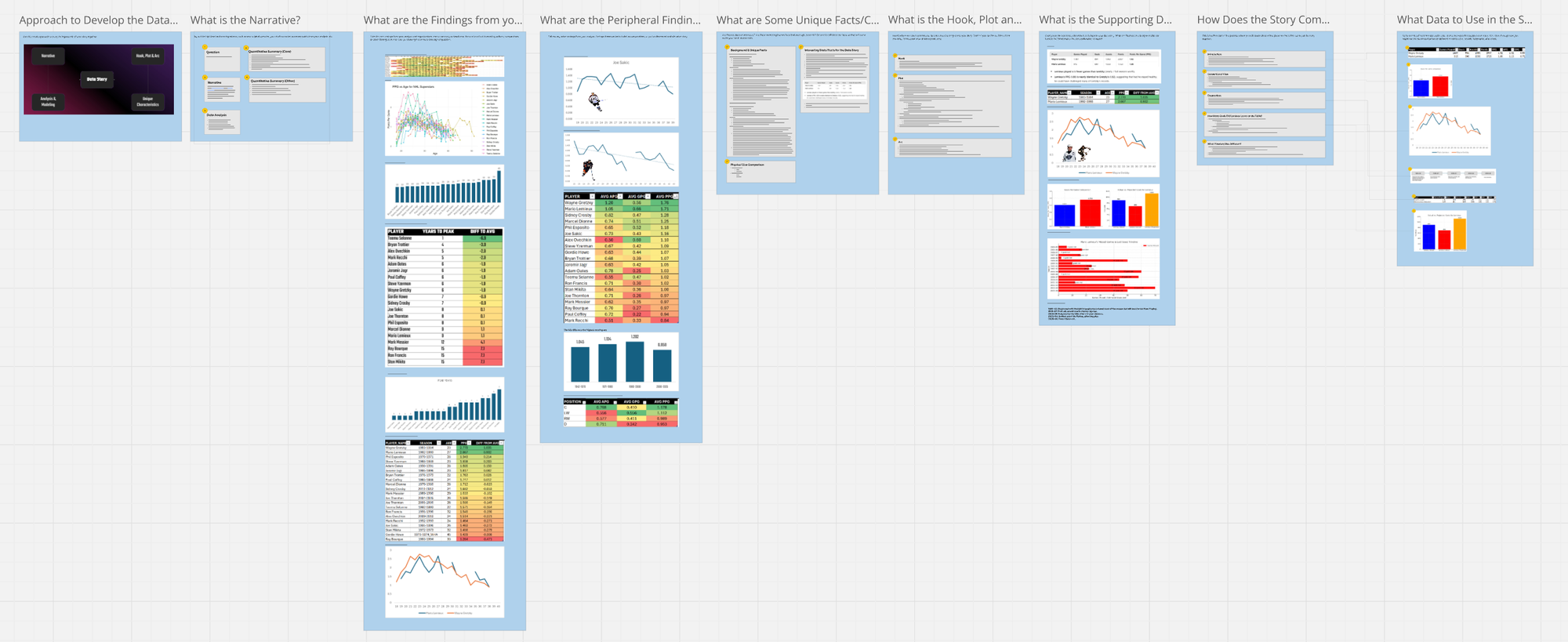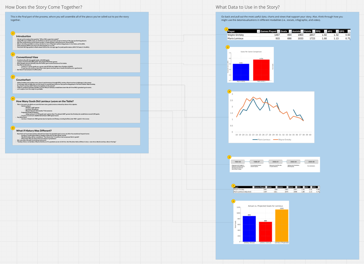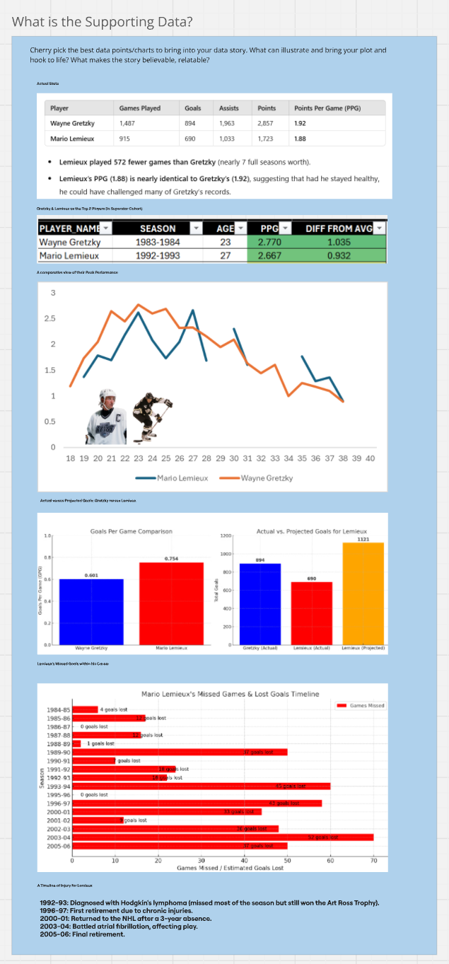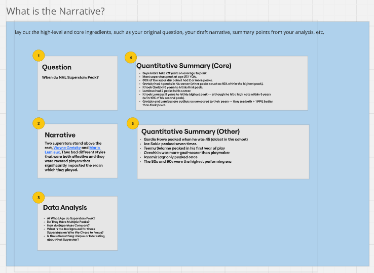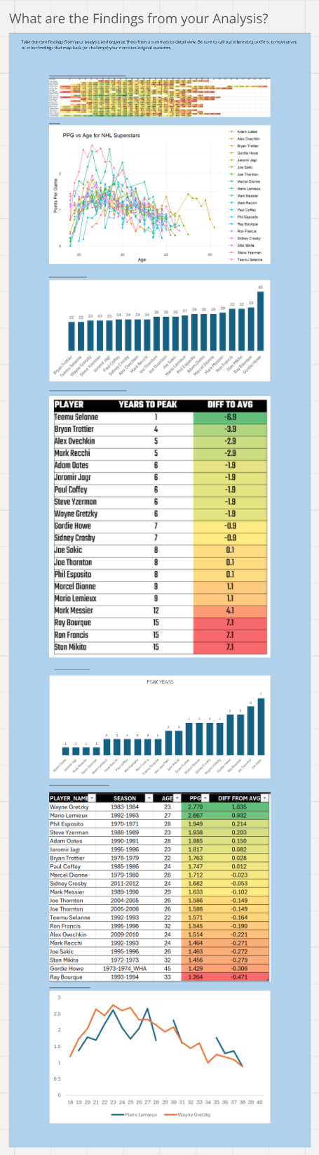 So, at this point you've got the structure of your story. You'll likely notice that we started with one question (When do NHL superstars peak?) and ended with a focus on Lemieux. Now, does this mean that our original question was wrong? No. We actually still have the original question driving our analysis. However, what it illustrates is that your data story evolves. And that's generally okay.