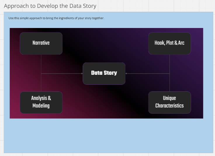 The first frame in the board is more decorative; it's a reminder of the high-level structure and approach for getting to our data story. And we've already covered this in detail, so let's move on.