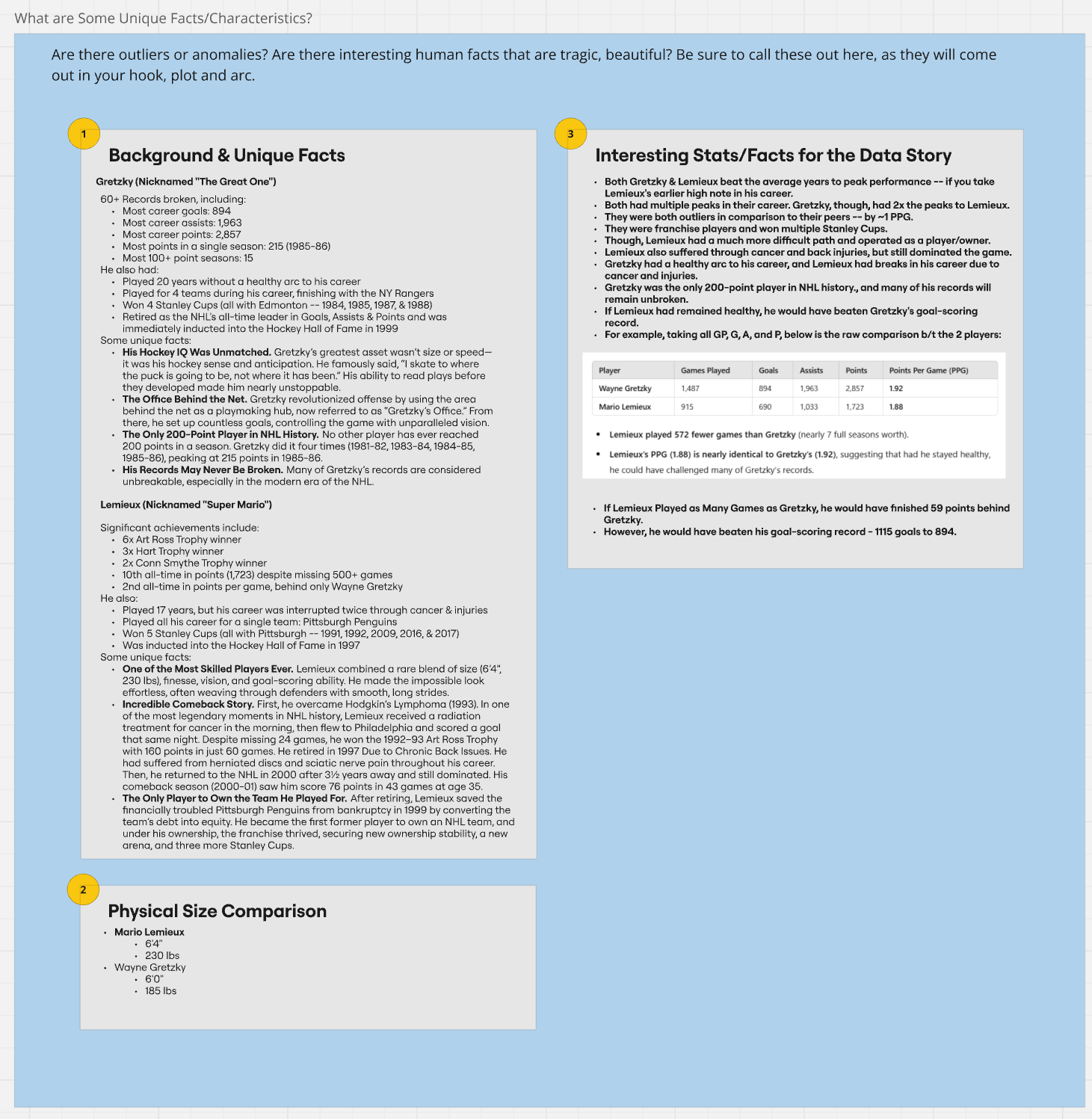 In our research, this is where we discovered interesting information about Lemieux and his battles with cancer and injuries, which raised the question of "what if?"