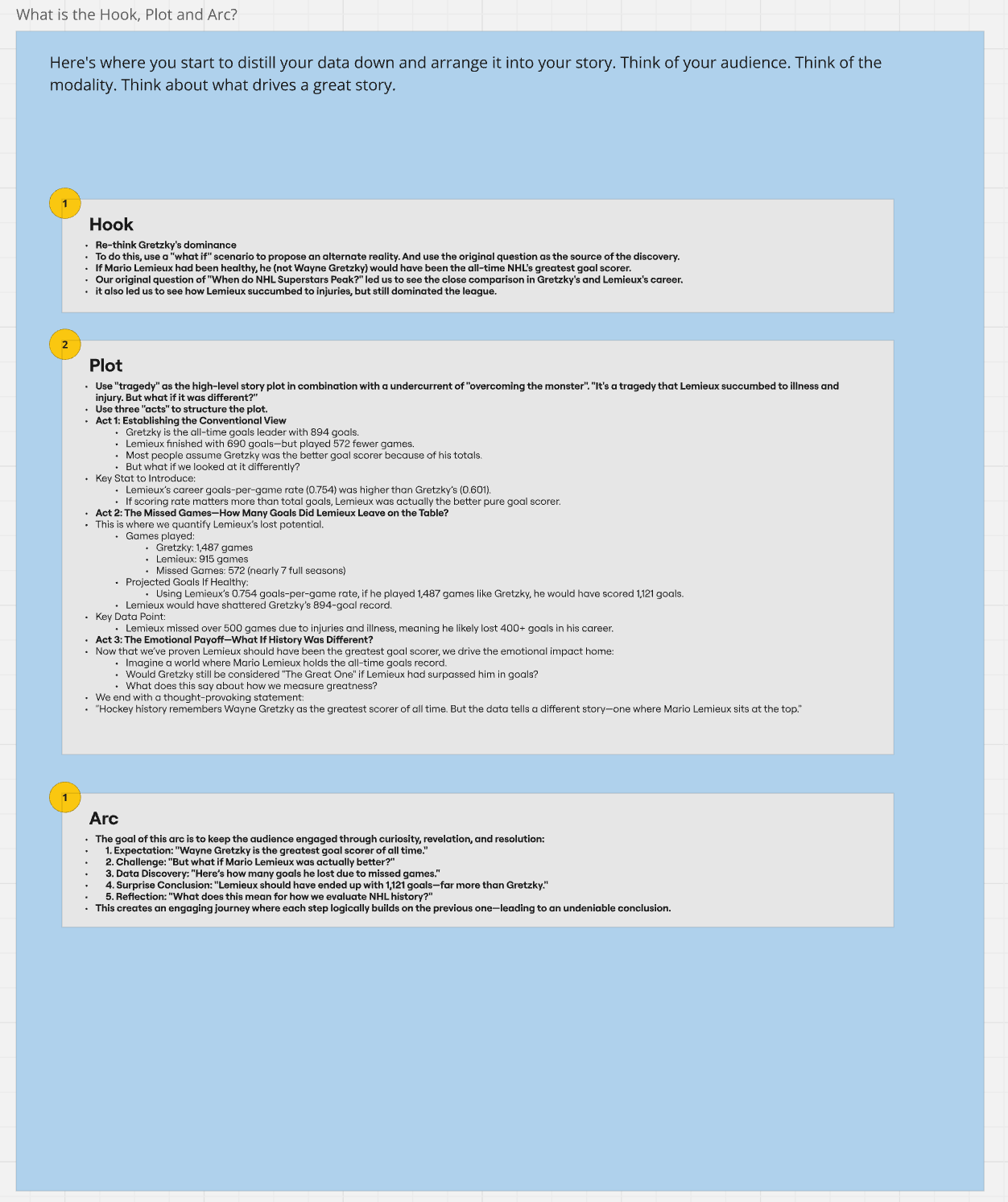 Every great story—whether it’s a novel, movie, or sports data report—follows a structure that keeps the audience engaged. This is where the hook, plot and arc come into play. Use these as tools to structure your data story. The hook is the compelling question or insight that draws people in (e.g., “Is Connor McDavid on pace to break Gretzky’s records?”). The plot is the logical flow of your findings, structured like an investigation. The arc is the resolution or takeaway—what did we learn, and what should we think about next?