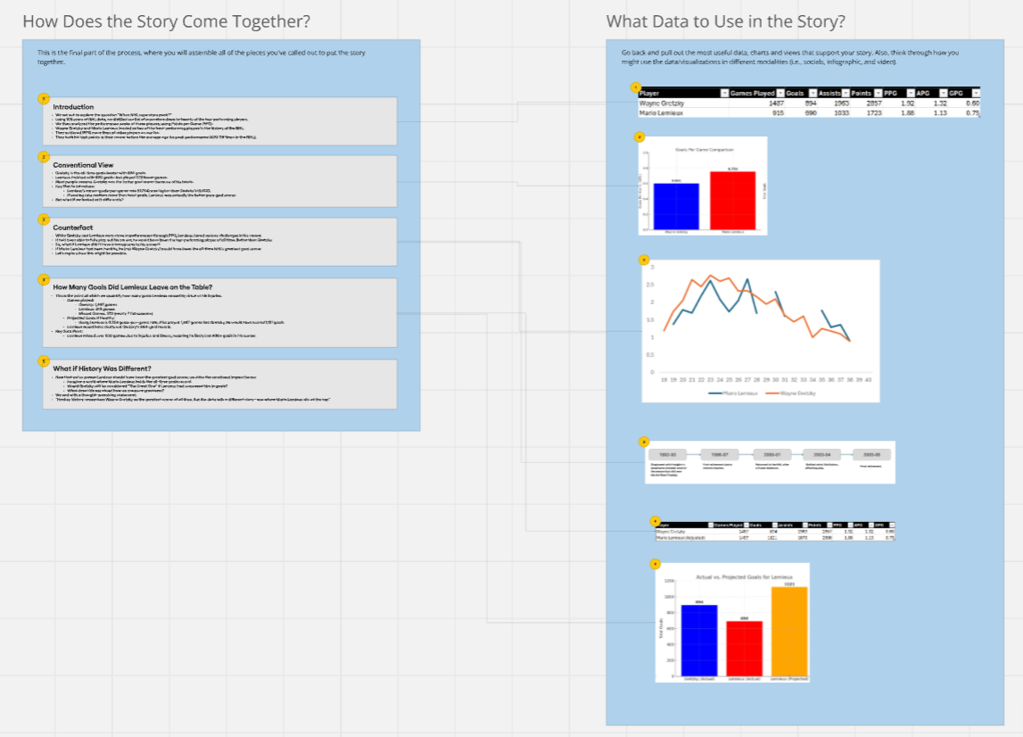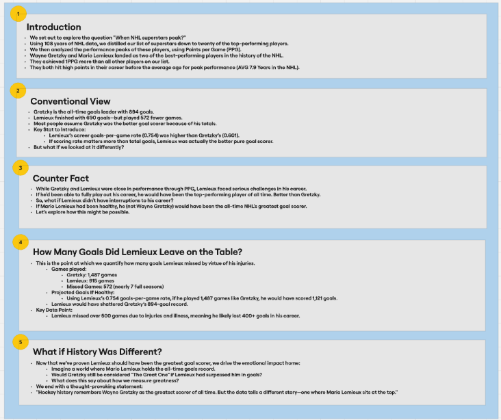 Real estate is precious on socials. For this example, we wanted to capture that Gretzky is the current record holder, but at the same time introduce the possibility that Lemieux could have beaten him needs to come through with fewer words and visualizations. In short, a theoretical contradiction of fact. That said, according to our data story outline, what we need is in the first three elements (Introduction, Conventional View and Counter Fact).