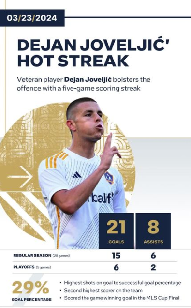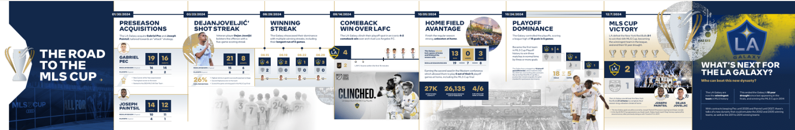 Infographics summarize complex data in a visually engaging and easy-to-read format. They use static images, data visualizations, heatmaps, and comparison charts to highlight key insights at a glance. Infographics can be very aesthetic, readable and unique – depending on how you design the visualizations. For example, here's a recent demo data story we built that celebrates how the LA Galaxy achieved their run to the MLS Cup. The data story was called "The Road to the MLS Cup."