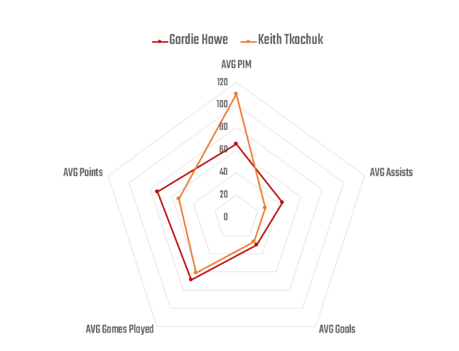 Long-form articles are best for providing full context, detailed breakdowns, and thorough analyses, allowing for a deep exploration of complex topics. Typically presented as blog posts, newsletters, or reports, this format enables creators to build a compelling narrative supported by data. For example, we regularly publish newsletters that are, in essence, long-form articles; one example is The Howes and Tkachuks: Grace vs Grit. At the core of this newsletter was a spider chart comparing Keith Tkachuk to Gordie Howe.