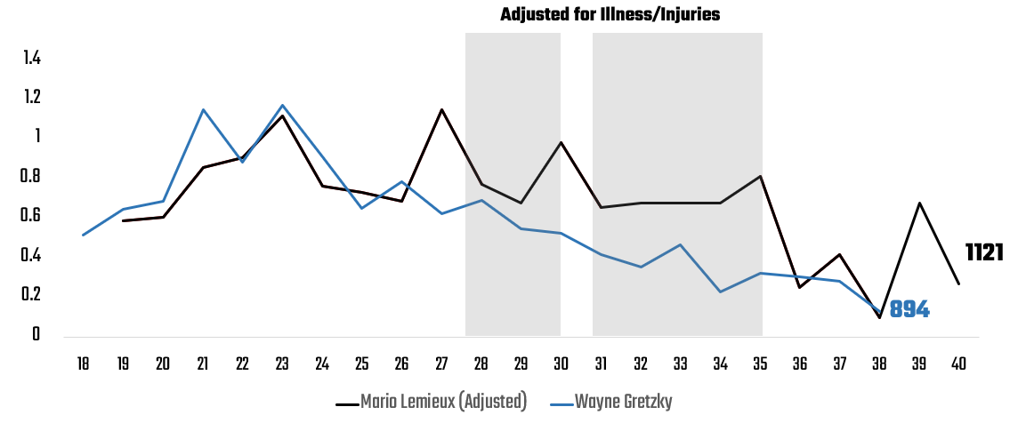 Then, we used the career GPG for Gretzky and the adjusted GPG for Lemieux through the arc of an uninterrupted career. We also used the line chart for both Gretzky and Lemieux (using adjusted values). Below, you can see Gretzky's true career arc (culminating in 894 goals) and a projected career arc for Lemieux (culminating in a projected 1121 goals). We've called out in shading where Lemieux's career was put on hold by cancer and injuries.