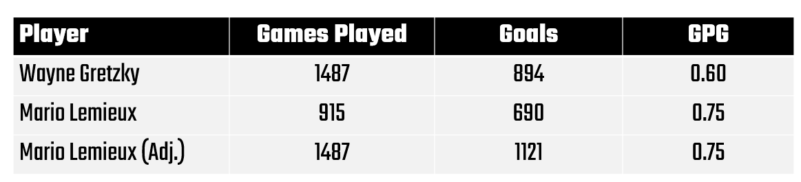 Interestingly, if Lemieux had played those years, you can see that the arc of his career would have taken a much different shape – one that both puts him ahead for scoring goals and with a significant delta as compared to Gretzky.