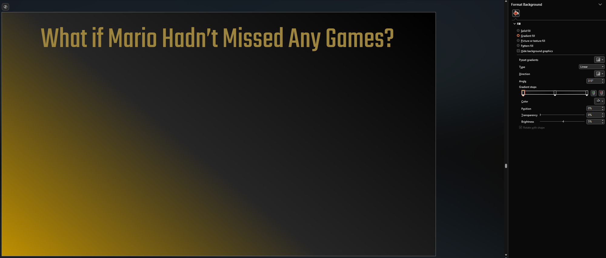 The first step is to create a new slide and format the background similar to the below. We used a gradient and then added the title: "What if Mario Hadn't Missed Any Games?"