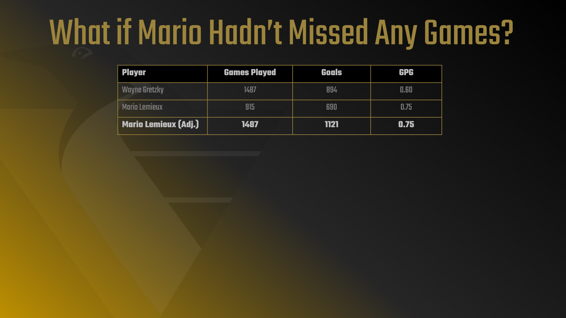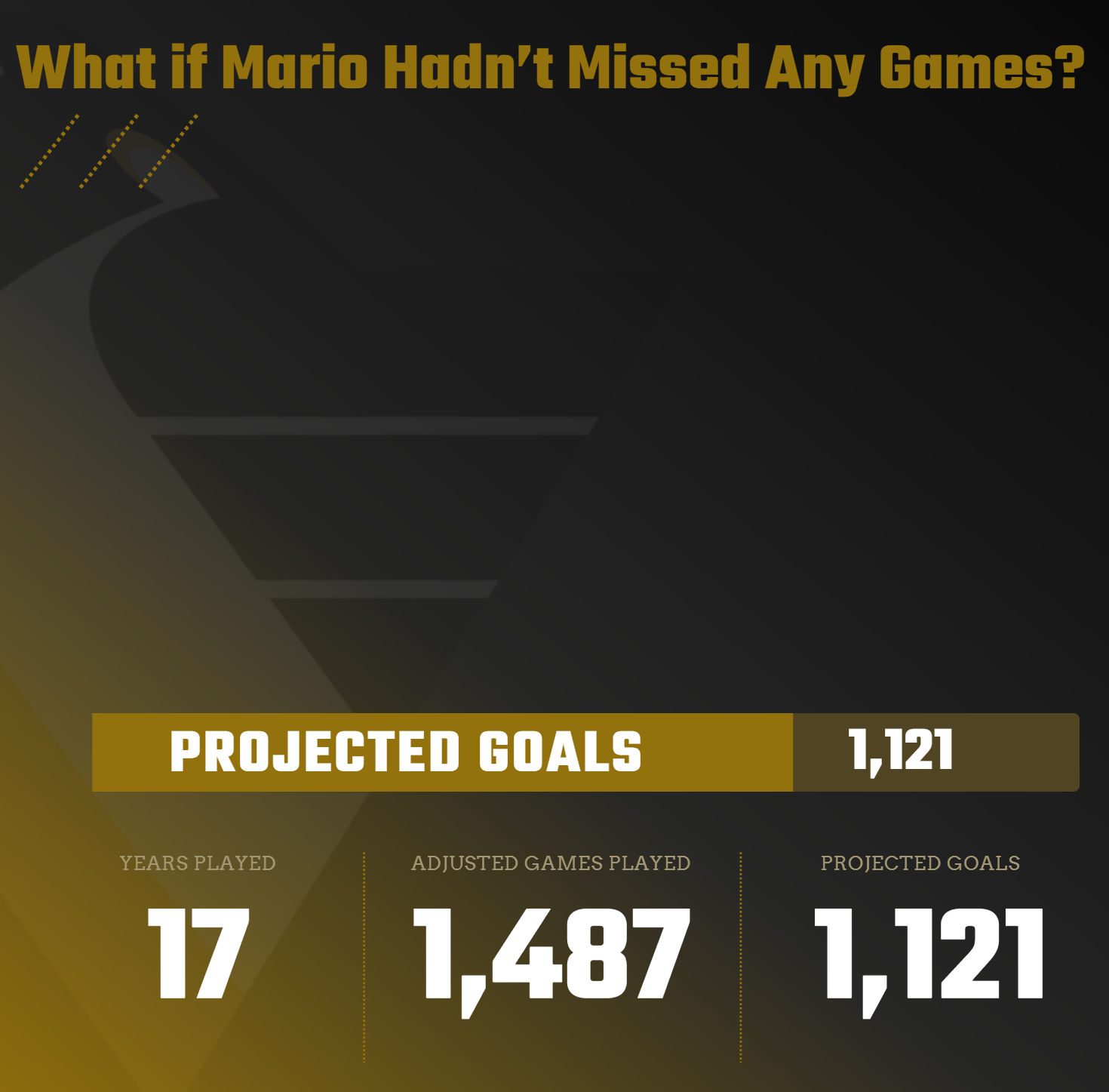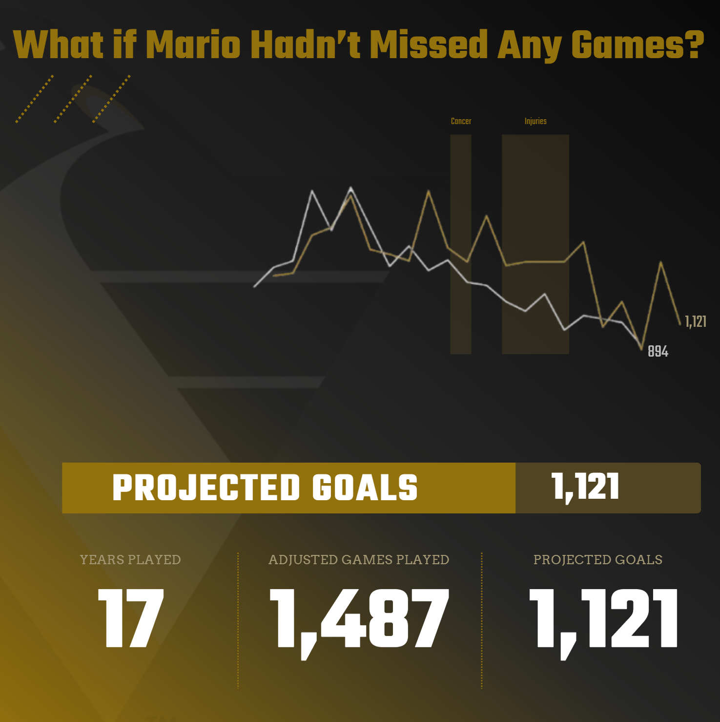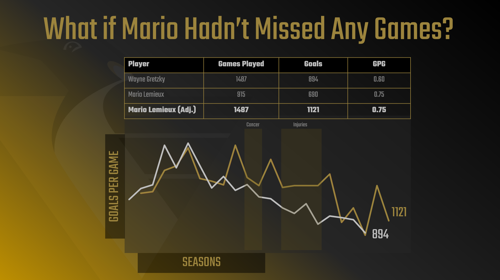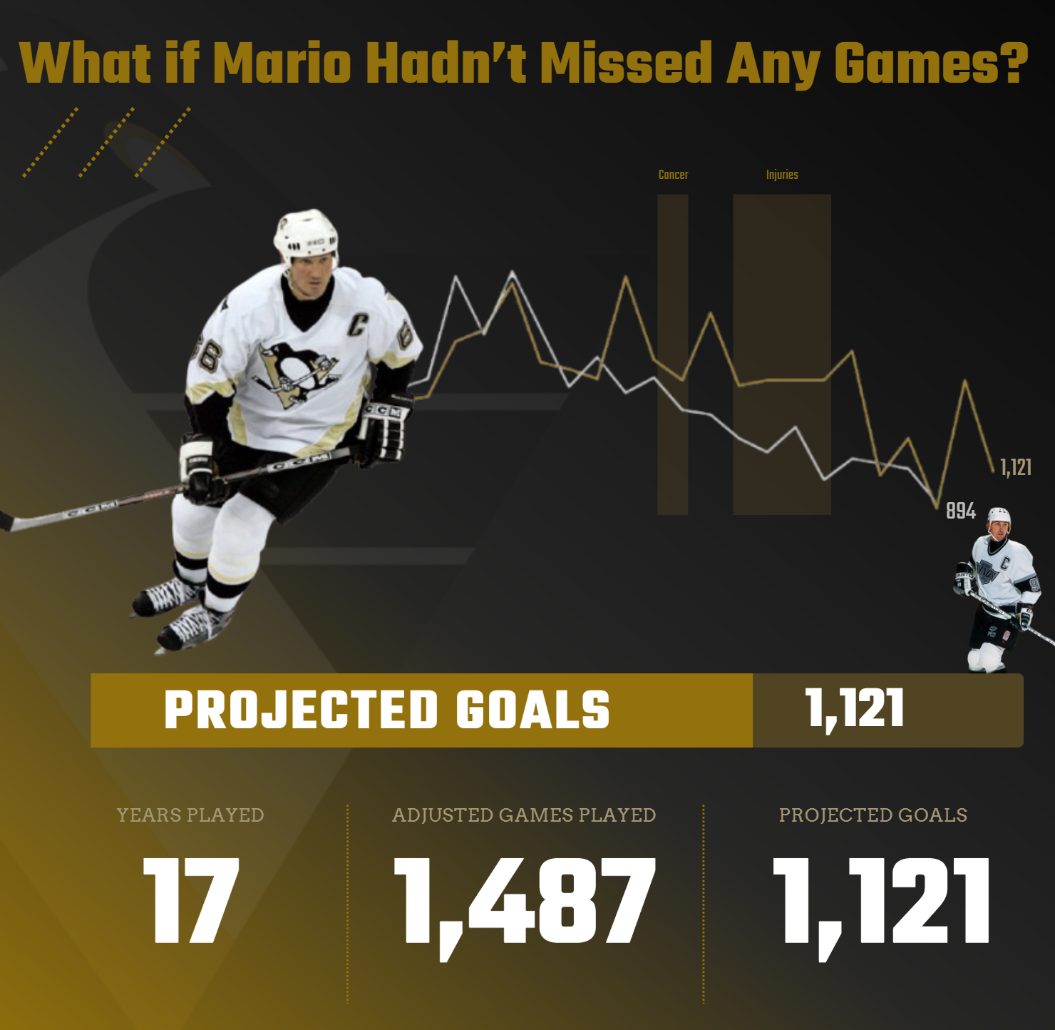 The question behind our data story was "When do NHL superstars peak?" If you've followed along so far, you'll have seen different potential stories stemming from this original question. One of the stories compared the career peaks of Wayne Gretzky and Mario Lemieux, which led us to the following hook: "What if Mario Hadn't Missed Any Games?"