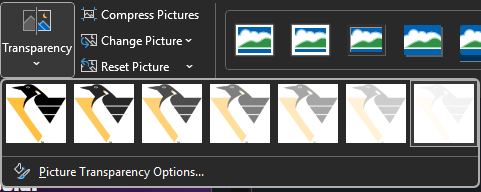 The next step is to add the Penguins logo. PowerPoint provides some modest picture formatting tools, such as Picture Transparency Options. You can use these options to help blend the logo into the background of the slide.
