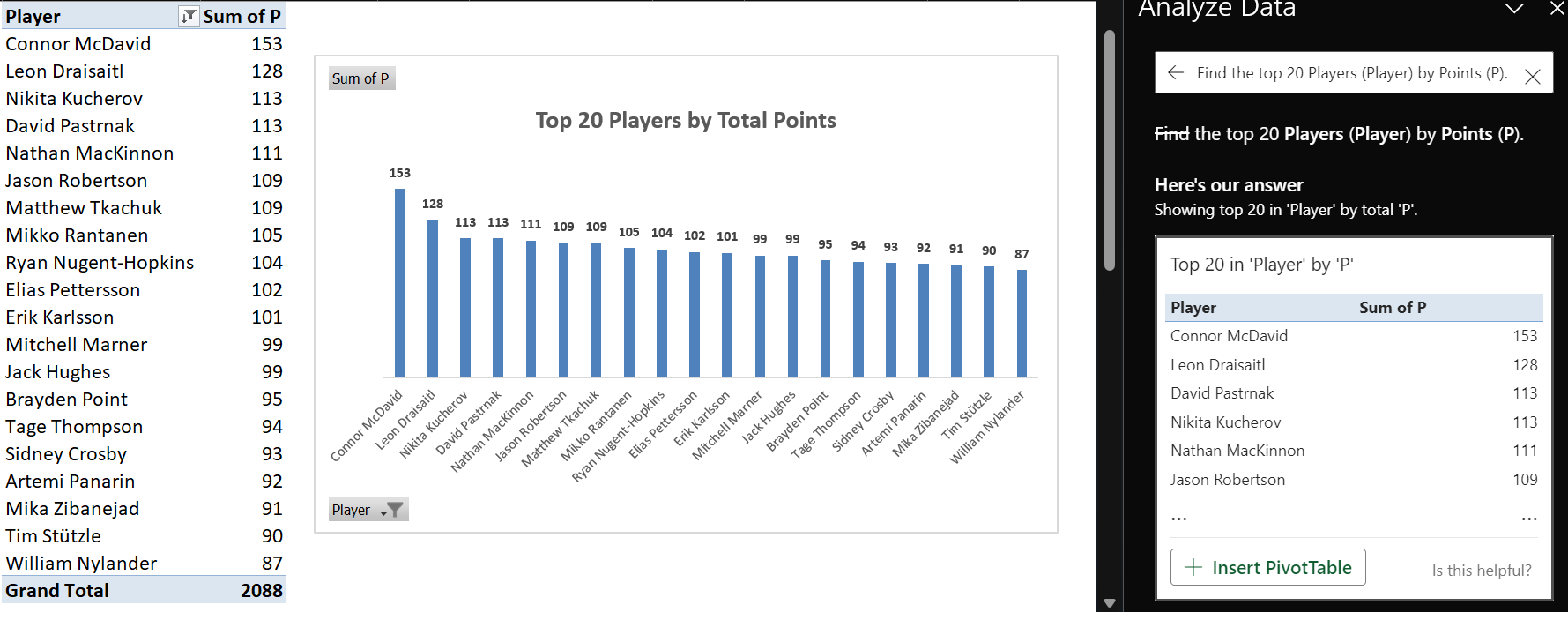 - Explore: Open the Excel file on your local desktop, position the cursor in the top left-hand cell and click Format as Table and choose a table format style. Click Analyze Data (Microsoft's new, automated data analysis feature) and type "Find the top 20 Players (Player) by Points (P)" in the Analyze Data field.