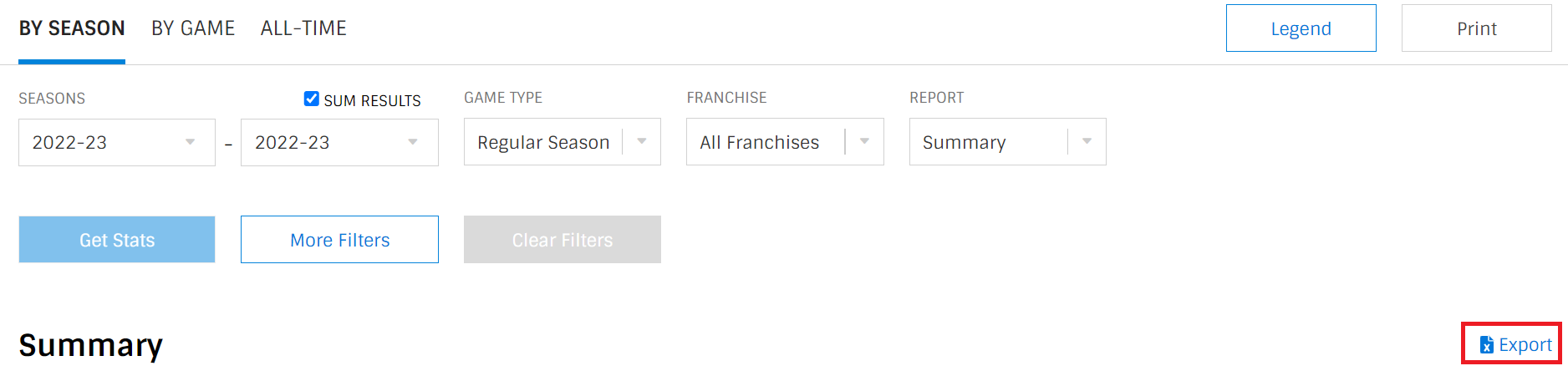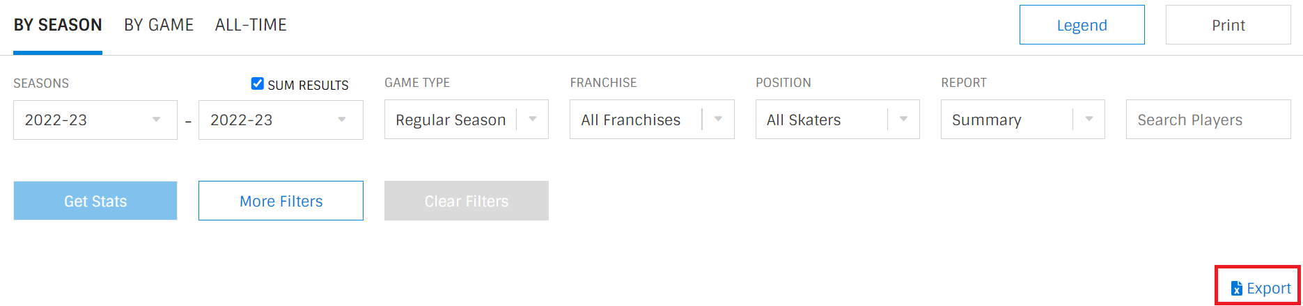 - The first step is to get some data. So, go to the NHL.COM team stats page and filter on the 2022-2023 Regular Season, select All Franchises and click Export.