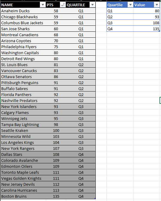 You now have the teams divided into quartiles based on the total points earned in the 2022-2023 regular season. More importantly, you have a Quartile pattern that you can apply to any statistic or hockey data. For example, you can use this pattern for Power Play Percentage, Faceoff Percentage, etc., and then look for patterns within specific quartiles. This can give you clues as key qualities that make an NHL team a top 25% club.