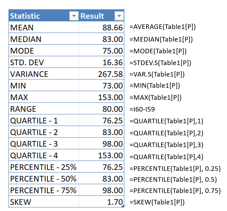 If you exported the first page of the 2022-2023 Regular Season Player Stats from the NHL site and then applied the Excel formulae for the above common statistics, then you'd arrive at the following summary statistics for the Top 50 Players by Points. (We added the specific Excel formula that corresponds to each of the above summary statistics.)