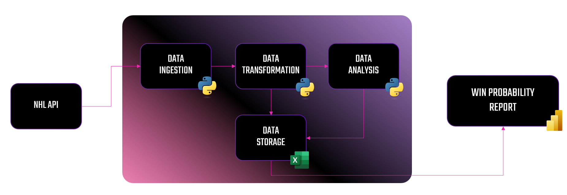 In this week's newsletter, we're going to put on our data engineer hat and build a homemade data pipeline. We'll use the NHL API as our data provider and build a basic data pipeline that results in a Win Probability (WP) report. The WP report will give you a view of each NHL team along with their Expected Win Percentage and Actual Win Percentage, so you can find the value teams on a daily basis. The below illustrates what we'll build out.