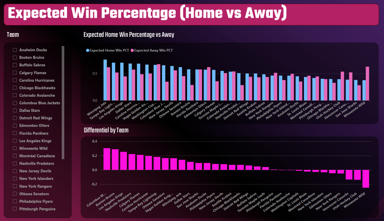 The resulting report is below. The key takeaway from the chart is to find the teams with the higher Expected Win Percentages when playing at home and with a differential that is positive towards home ice. For example, Winnipeg, Tampa Bay and Los Angeles all have higher Expected Win Percentages when playing at home.