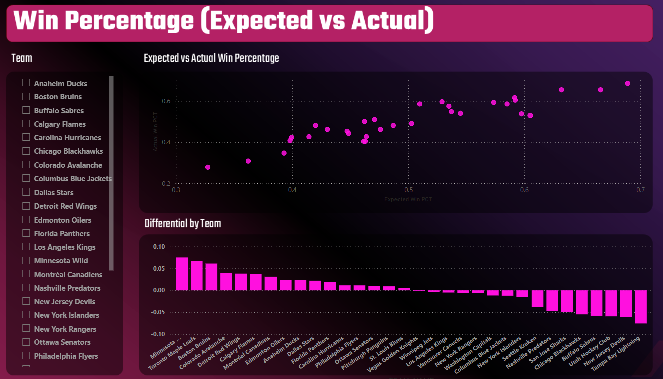 The goal of the data pipeline was to create a refreshable report, which you can use to track the Expected and Actual Win Percentage of NHL hockey teams – using the NHL API. If you're into DFS or sports betting, this type of report (and the ability to create a homemade data pipeline that gives you updated data on a daily basis) will help with your decision-making process.