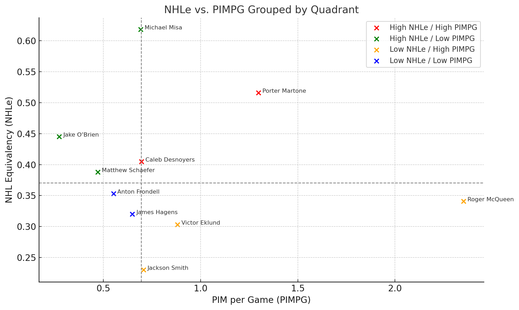In a past newsletter entitled The Howes and Tkachuks: Grace vs Grit, we explored a rare correlation between point production and grit. We wanted to run the top ten through the same analysis, so we used NHLe for point production and PIM per Game (PIMPG) for grit. Players who show both scoring potential and physicality stand out as rare and valuable prospects — often pegged as power forwards or tough, skilled forwards.
