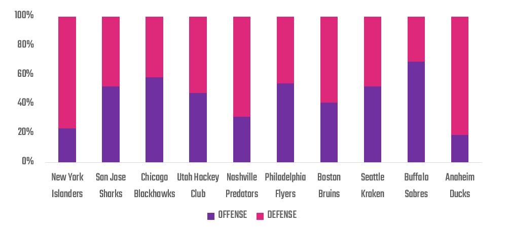 We wanted to calibrate and compare the teams, so we created an Offense and Defense composite metric. Each metric was calculated using different stats and then normalized to range from 0 to 100 (lower numbers are bad and higher numbers are good). The Offense metric included Goals For per Game, Power Play Percent, and Shot Percent. The Defense metric included Goals Against per Game, Penalty Kill Percent and Save Percent.