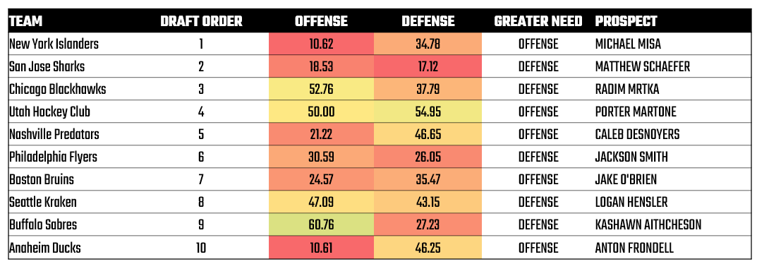 For example, the New York Islanders are stronger in defense than in offense. So, as the first one out of the gate, they'll need to decide if they go for Matthew Schaefer (the top defensive prospect) or Michael Misa (the top offensive prospect). As you evaluate each team against the incoming prospects (and their respective strengths and weaknesses), you can begin to see where a prospect could benefit a team's roster (either at the NHL level or in their minor league teams to prepare them).