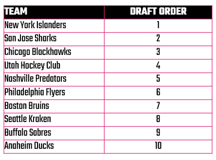 We've simplified the analysis here to NHL-ready point production, and if the numbers bear out these prospects could be decent players in the first round. But before we get to match-making, let's check out the top ten teams in the first round of Draft 25.