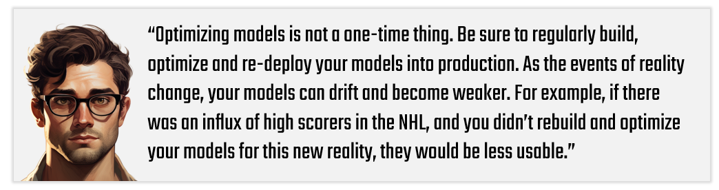 Simply put, model optimization is the process of improving the performance of your model. For example, if you build a multivariate Linear Regression model to predict team goal-scoring (let's say it's shots on goal, expected goals, faceoff percentage, and penalties), you might optimize the model by reducing the number of predictors (such as penalties) which should result in a stronger model. This process is called optimization.
