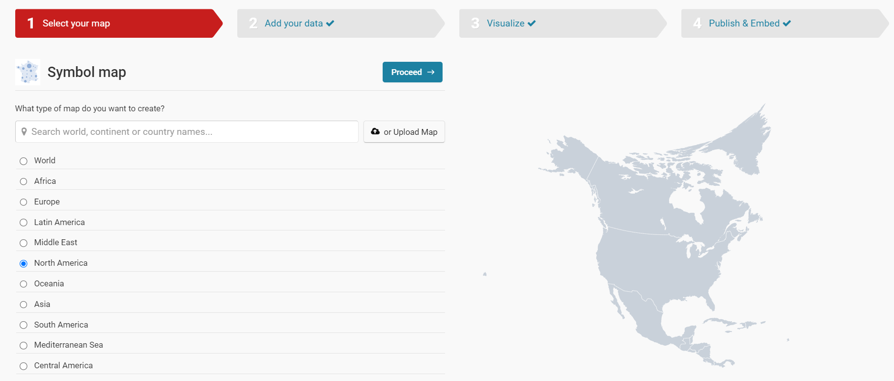 The first step in the Datawrapper wizard process is to select the geographical region for your map. Our dataset covers Canada and the USA, so select North America and click Proceed.