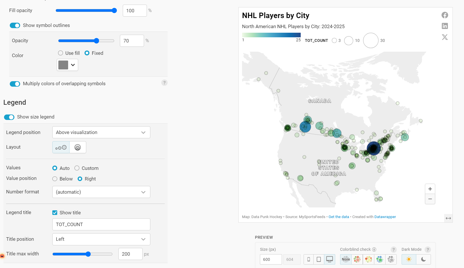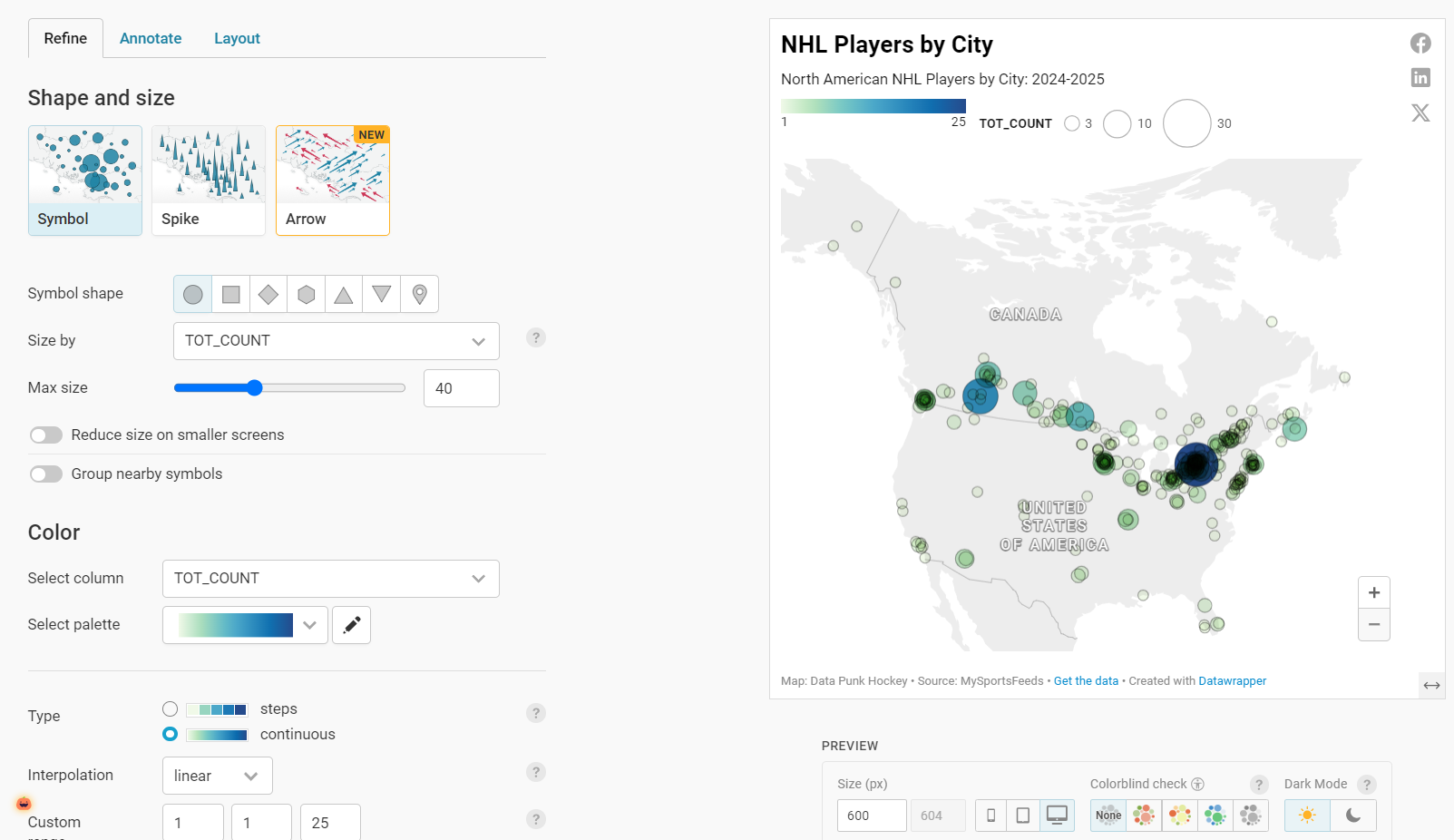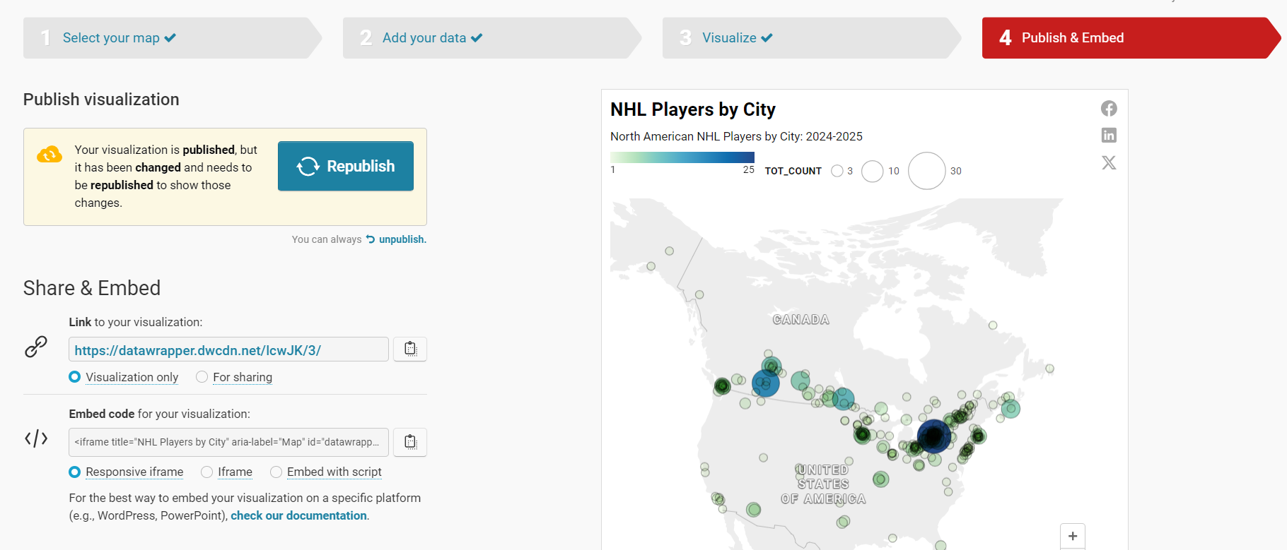 This is the third tutorial in our premium content series: Fifty Charts. In this week's tutorial, we'll walk through how to create a choropleth map in Datawrapper that shows the total count of NHL players' birthplace from different cities in North America. You might think of this as a proxy for what cities produce the most NHL players in North America.