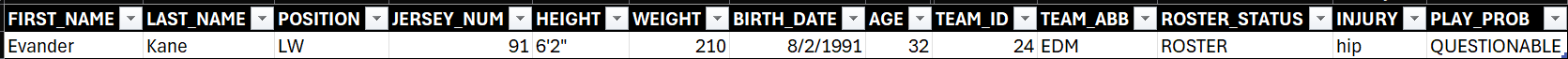 For player injuries, we pay for a hockey data provider which gives us the injuries for that day. The REST API for our data provider returns a CSV of the players who are on the injury list for that day. Here's an example row of data that is returned that we can then use. The useful information here is the player first and last name, their position, team, injury and play probability.