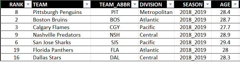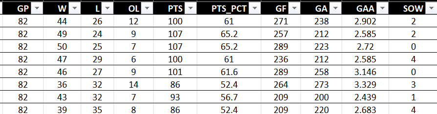 You'll see that the dataset includes multiple seasons worth of data with team metadata (e.g., team name, abbreviation, division, etc.) and raw summary stats (e.g., games played, wins, losses, etc.) and calculated summary statistics (e.g., points percent, powerplay percent, PDO, etc.).