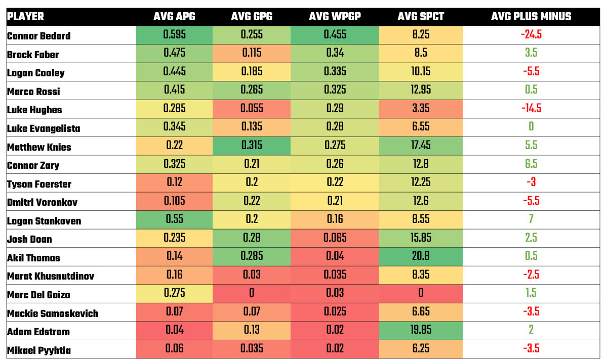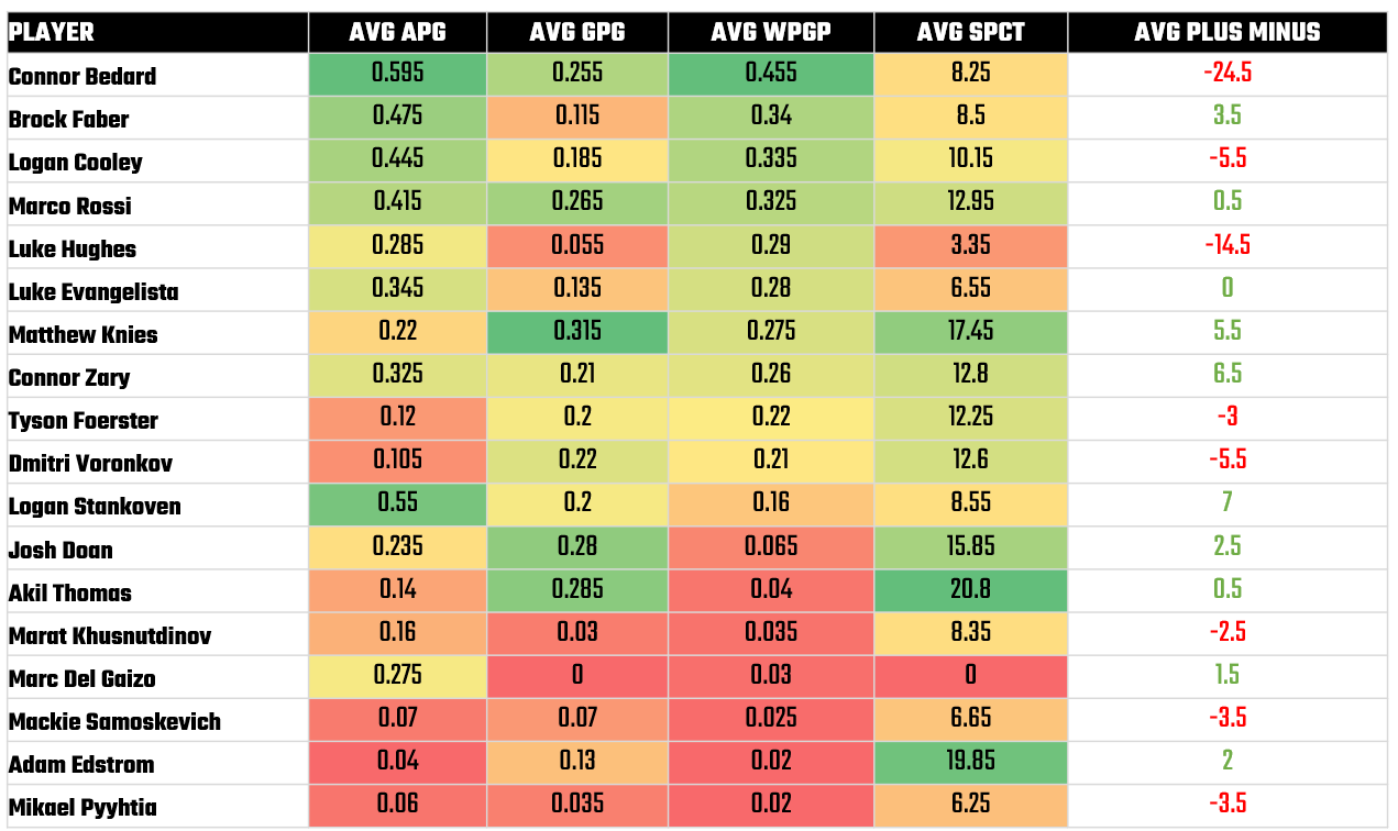 "Luke Hughes", "Connor Zary", "Logan Cooley", "Marco Rossi", "Luke Evangelista",
