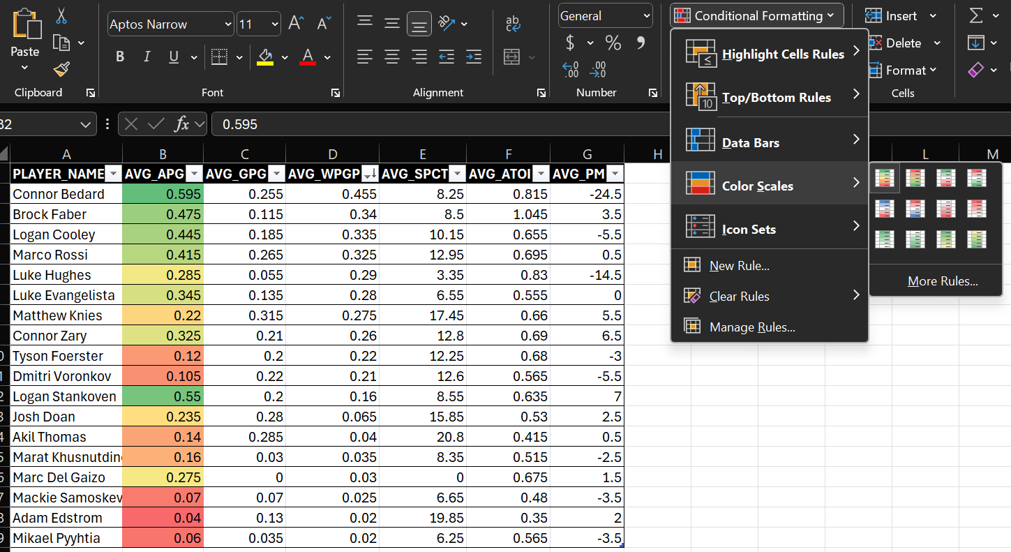 Select the cells in the AVG_APG column and click Conditional Formatting, Color Scales, and select a color scale. Your first column should now look something like the below.
