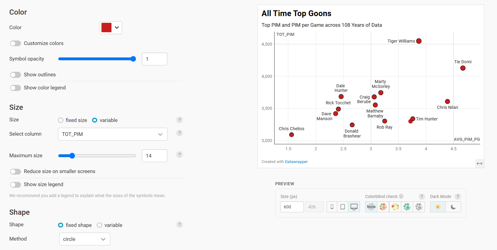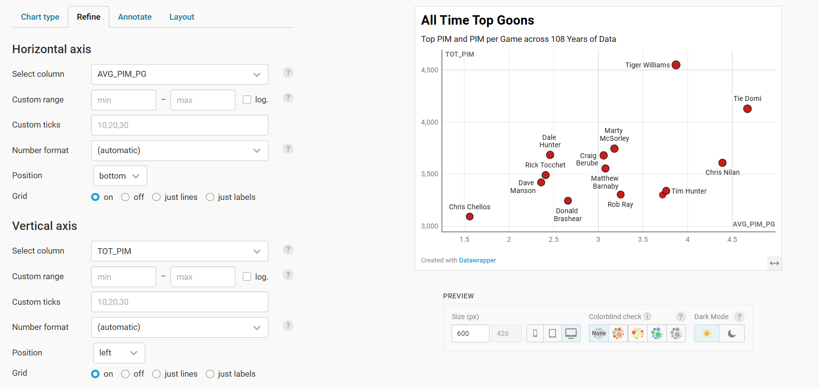 In this tutorial, we'll build a scatter plot that answers the following question: Who is the Top Enforcer in 108 Years of NHL Hockey?