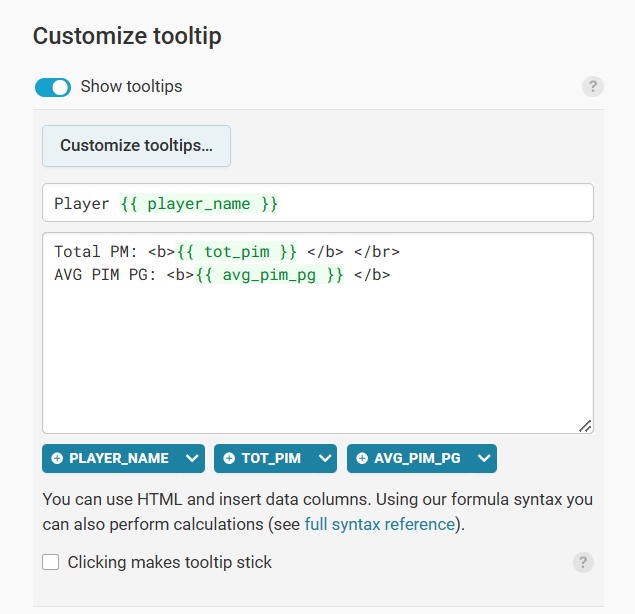 You can use the Annotate and Layout tabs to further configure the scatter plot to your liking. Note that you can create custom tooltips for your scatter plot, so when you mouse over the markers, the visualization displays information about the player.