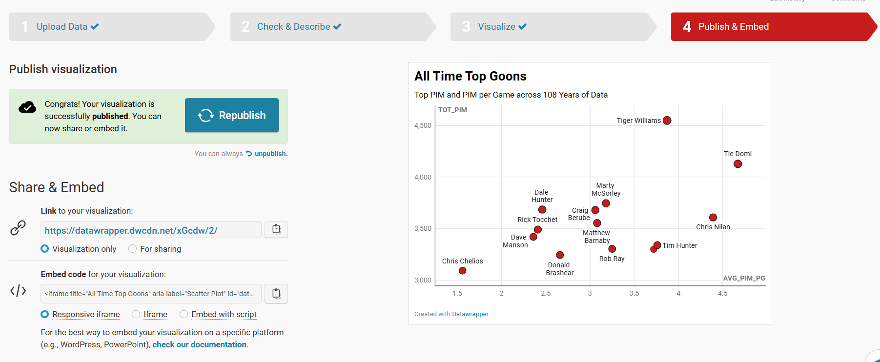 When complete, click Publish & Embed to complete the publishing of the plot. Here you click Publish (or Republish).