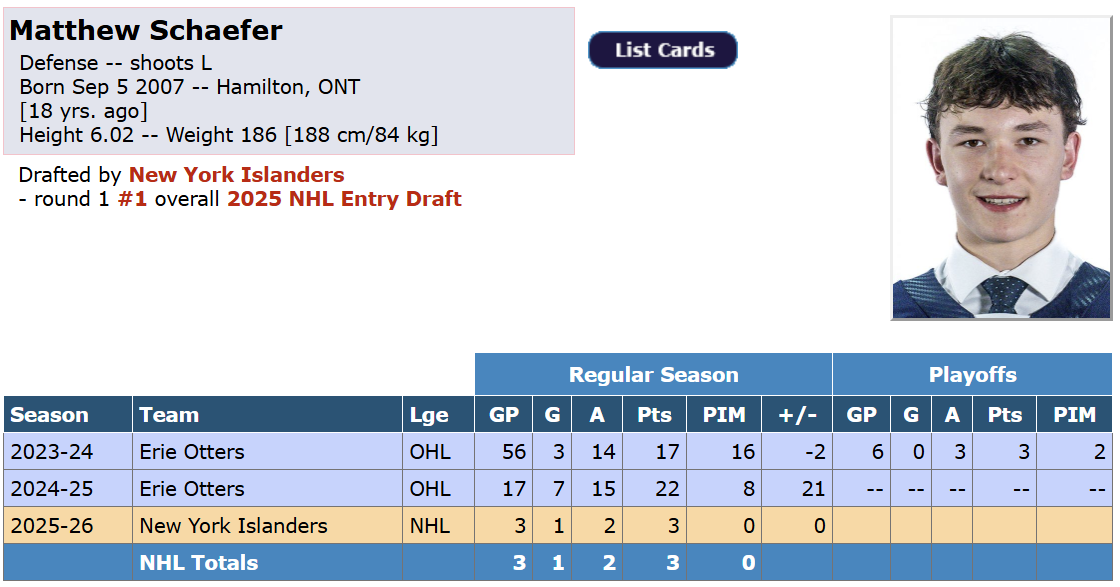 Hockey DB lays out Schaefer's stats. In 17 OHL games, he posted 22 points (7 goals, 15 assists) and carried a plus-21 rating — despite a season shortened by injury (a broken clavicle and earlier mononucleosis) and personal tragedy (he lost his mother in 2024). You can see his OHL stats alongside the first 3 games of his NHL career below.