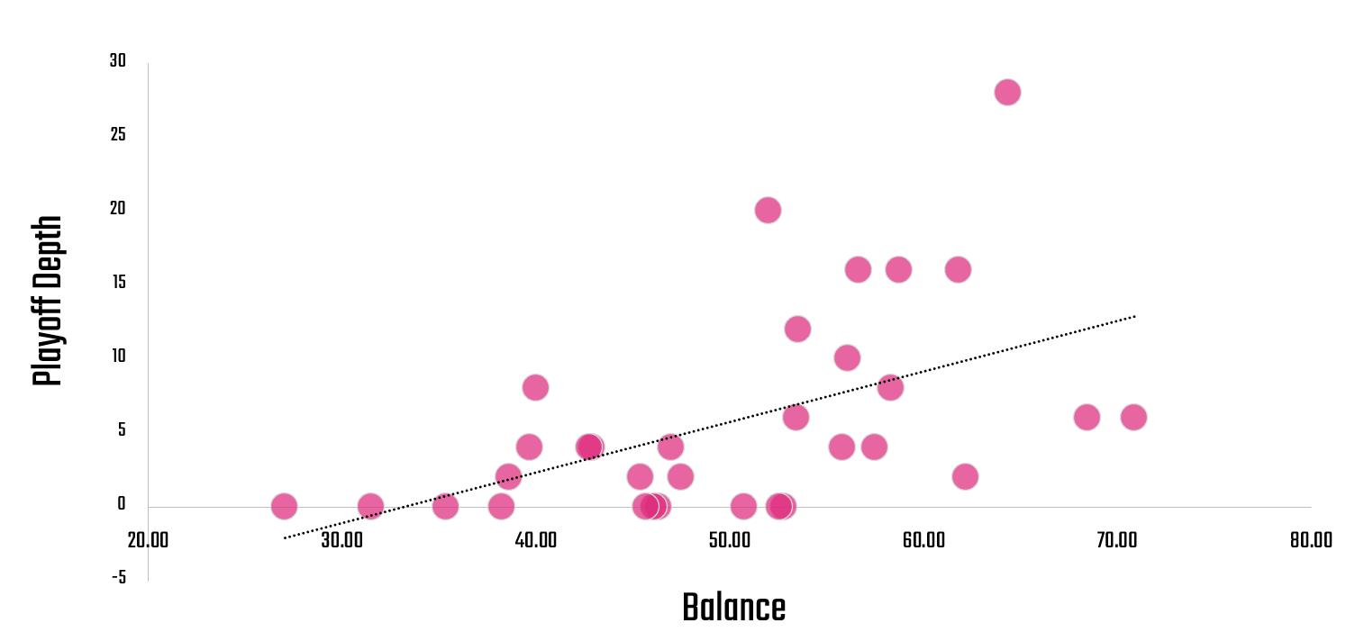 Looking back over the last three seasons, higher TBI scores have directionally lined up with deeper playoff runs. The correlation isn’t ironclad (so we wouldn't recommend this as a predictor) but the trend is evident: balance can travel.