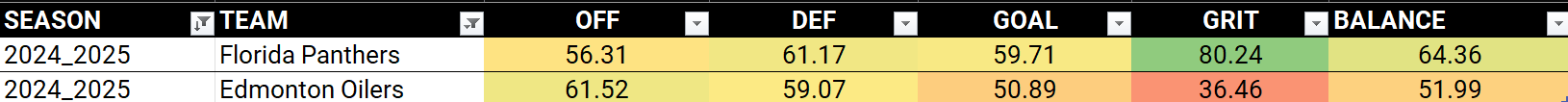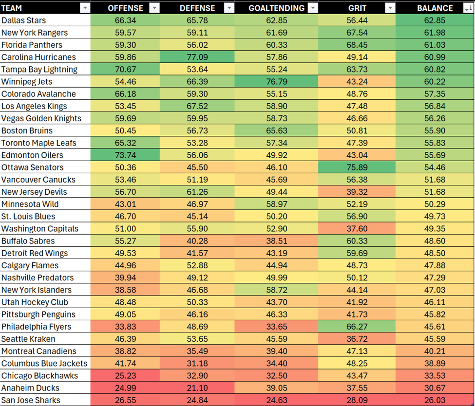 The TBI is our shorthand for measuring four core areas: Offense, Defense, Goaltending, and Grit. The teams that win in June don’t just dominate in one category — they’re solid across all four. Just ask Oilers fans how much grit mattered last spring.