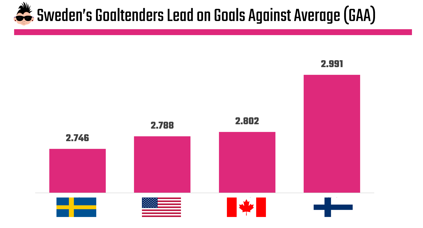 For the second year in a row, Sweden takes the top spot for Goaltending. They lead in both Goals Against Average (GAA) and Save Percentage, both of which are shown below.