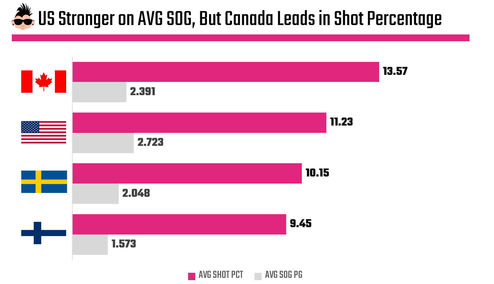 However, the results here are interesting because while the USA has a higher average SOG per player (2.723), Canada leads in average Shot Percentage (13.57).