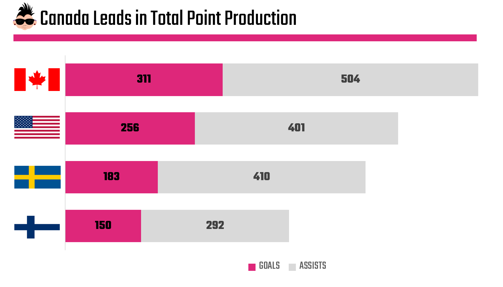 For example, this probably comes as no surprise, but Canada is strong on shots and converts those shots into point production. The USA is strong across the board, but didn't necessarily finish first in any one area. Sweden, similar to last year, came in strong for goaltending. They also were strong on puck possession. And Finland (this caught us off guard) came in strong in physicality – perhaps they'll be the agitator?