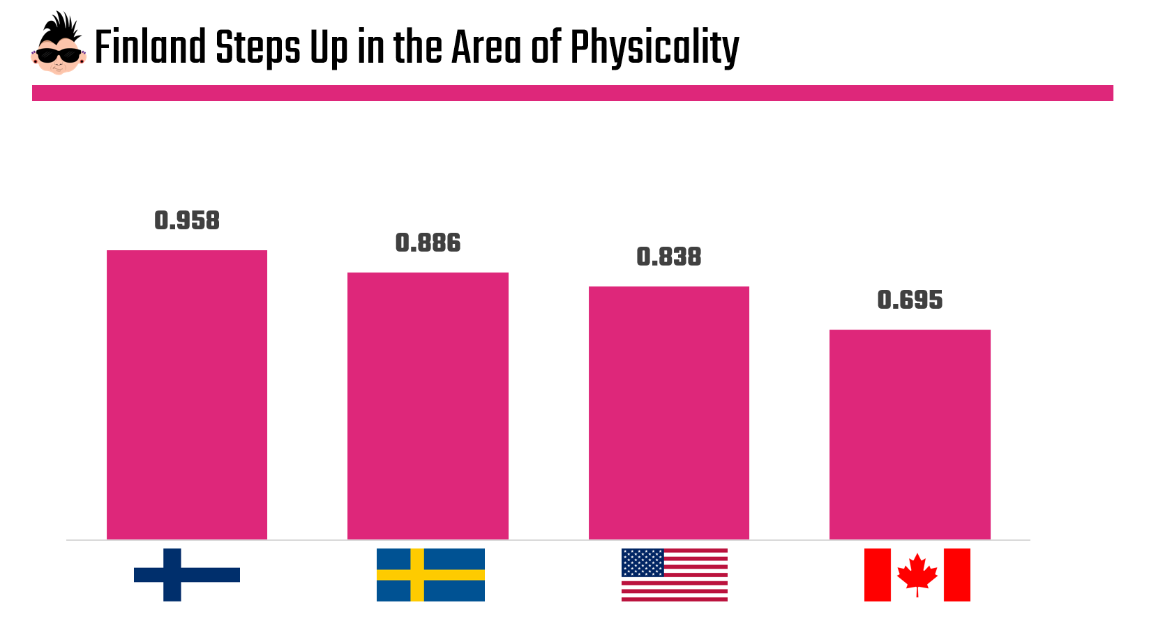 And finally, we also looked at a team's physicality. We created a custom metric to represent this, so similar to the Puck Possession metric you might find some variance in your own analyses. That notwithstanding, the results surprised us: Finland came out ahead. Yeah, who would have guessed?
