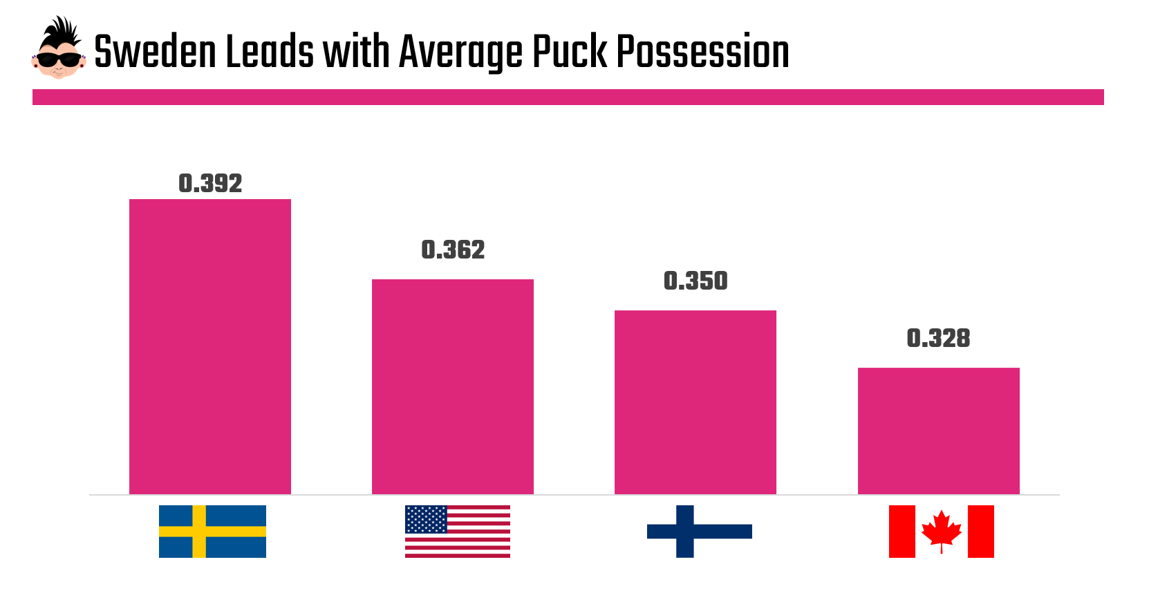 Puck possession is key in hockey because those teams that typically can control the puck more tend to convert. Our data provider unfortunately doesn't include CORSI, so to measure puck possession, we created a custom metric combining different statistics, and interestingly Sweden came out on top.