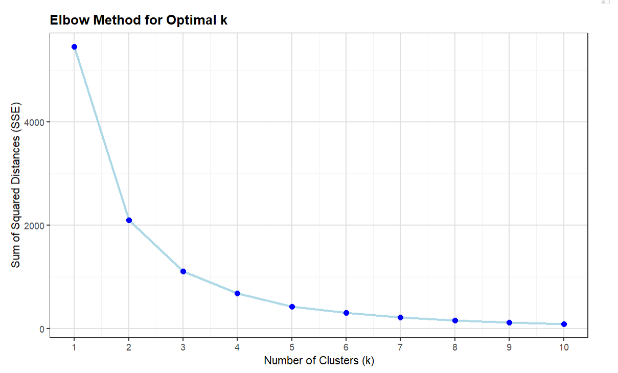 The resulting plot (using the Elbow Method referenced earlier in this newsletter) provides you with a way to decide the number of clusters you'll use as the k parameter in your K-means cluster analysis. The way to interpret the Elbow plot is that it shows where the SSE begins to decrease more slowly, which forms the "elbow" shape. By visually inspecting the Elbow plot, the optimal k is often at this elbow point because it balances the trade-off between having too few clusters (high SSE) and too many clusters (increased complexity with little SSE reduction). For our cluster analysis, we'll use 5 as the k parameter.