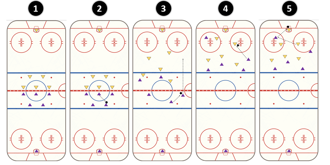 We've created a sequence of images to represent five steps where the puck was dropped to the point of the goal being scored.