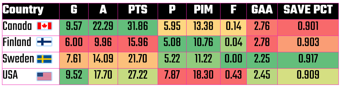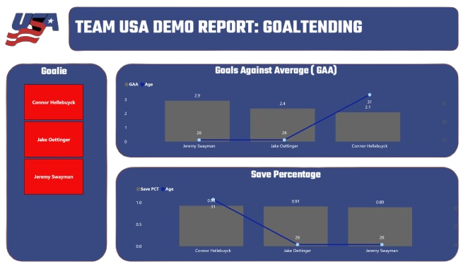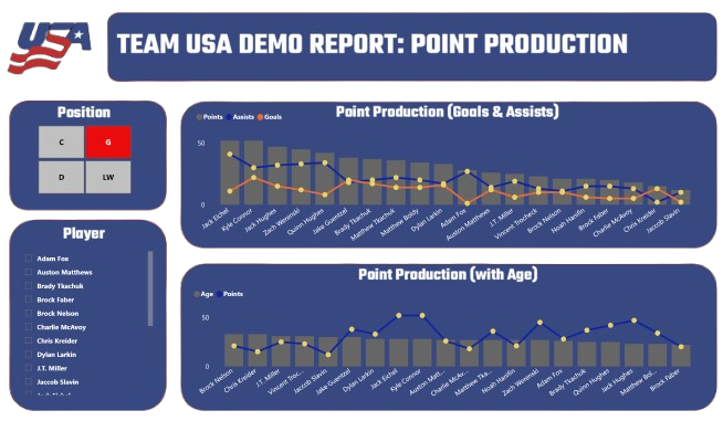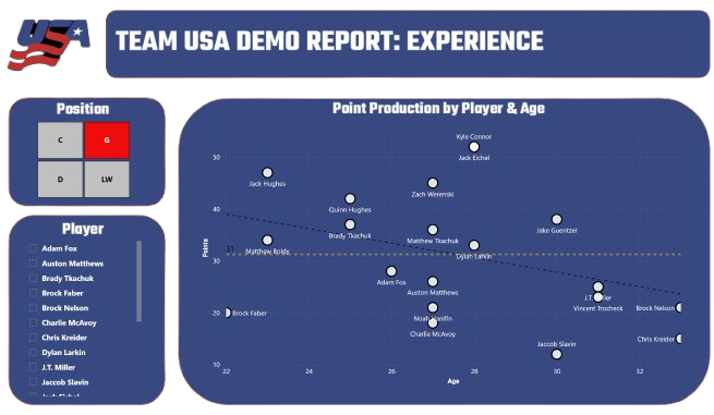 We only excluded goalies from this report, which shows a strong offense and a d-line that can move the puck up the ice. Also, several players are putting up solid goals and assists, e.g., Jake Guentzel, Brady Tkachuk, Matthew Tkachuk, Matt Boldy, and Dylan Larkin. Further, Team USA has deep playmaking skills led by Jack Eichel, Jack Hughes, Zach Werenski, and Quinn Hughes.